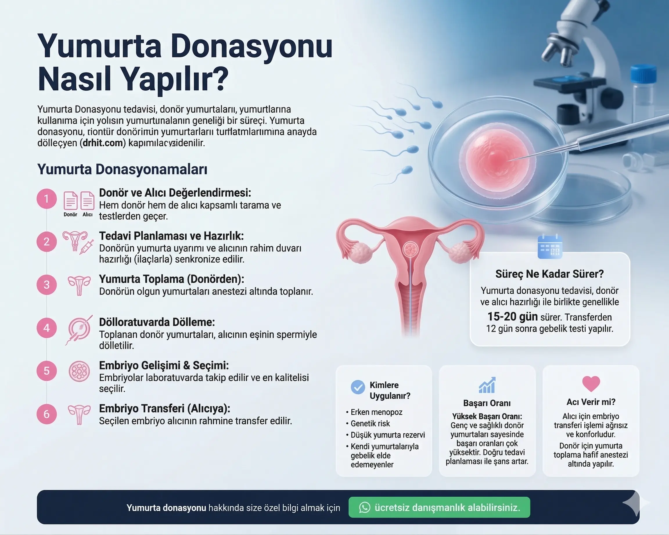 Kıbrıs’ta yumurta donasyonu tedavisi; doğru hasta seçimi, dikkatli donör taraması, gelişmiş embriyoloji laboratuvarı ve kişiye özel tedavi planlaması ile yüksek başarı potansiyeli sunan yardımcı üreme yöntemlerinden biridir.